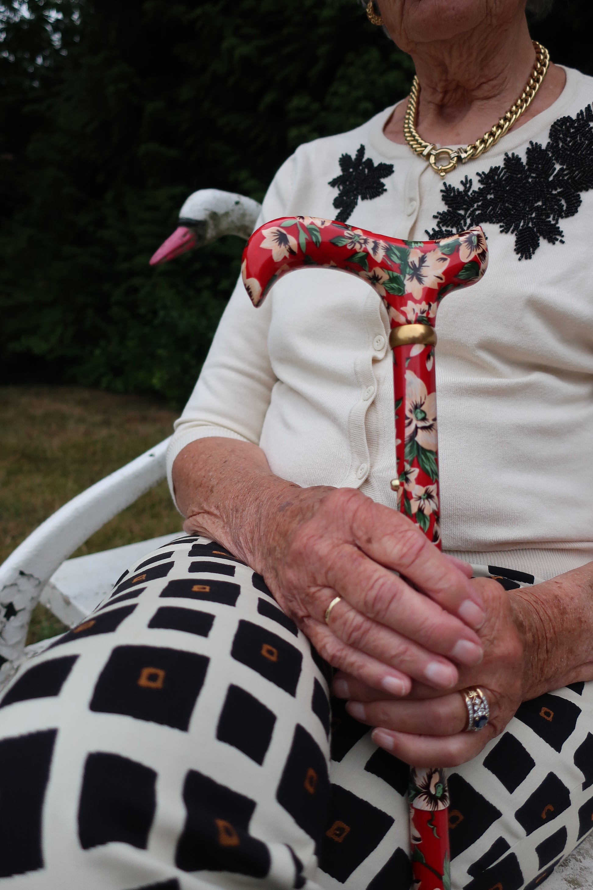 Met deze rode passievrucht wandelstok voegt u lef en flair toe aan uw dag. De print is stoer en speels tegelijk en laat zien dat u durft te kiezen voor een statement, ook als het om een wandelstok gaat. Perfect voor wie graag een vleugje power toevoegt aan elke stap.