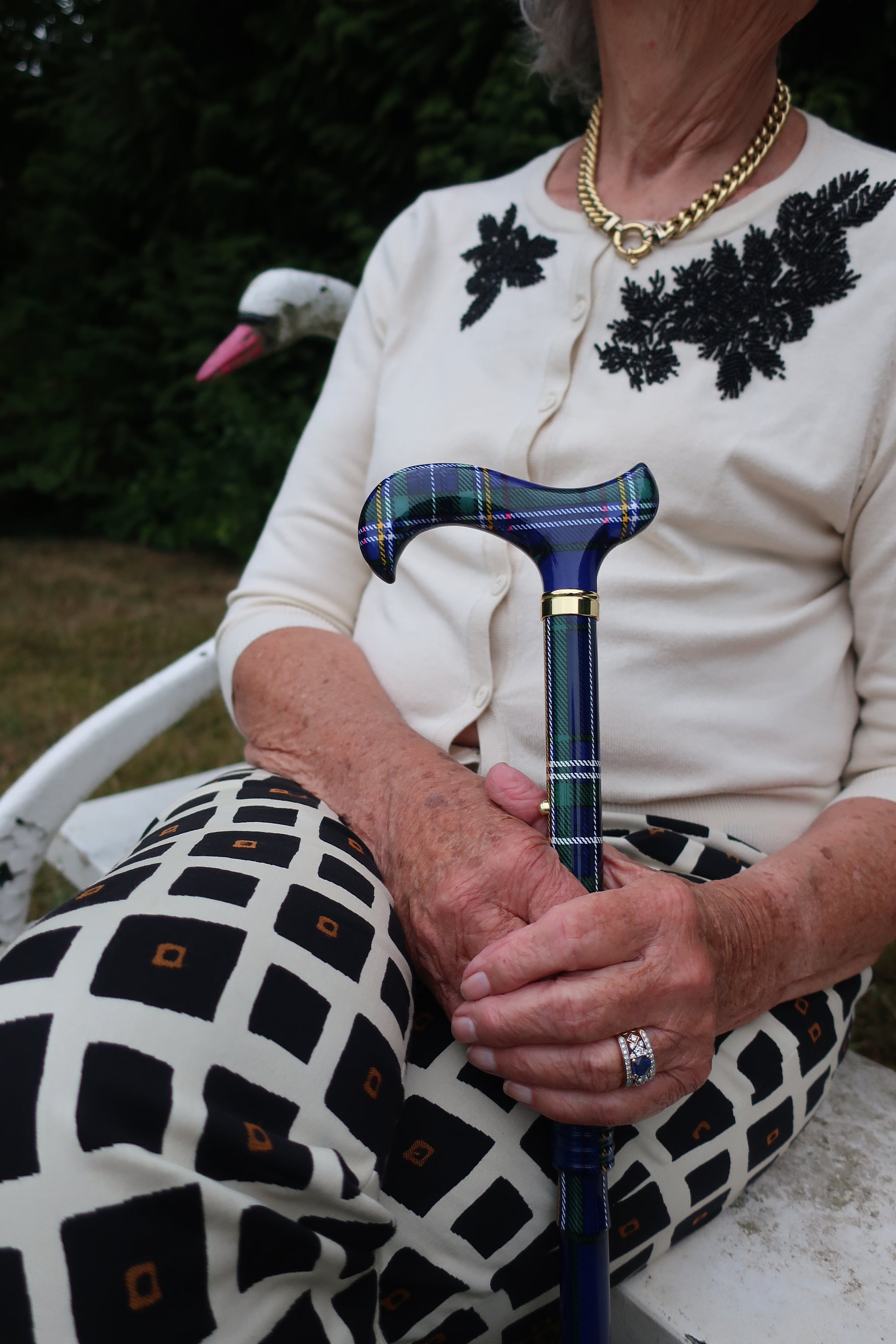 Met deze Schotse Ruit wandelstok voegt u lef en flair toe aan uw dag. De print is stoer en speels tegelijk en laat zien dat u durft te kiezen voor een statement, ook als het om een wandelstok gaat. Perfect voor wie graag een vleugje power toevoegt aan elke stap.